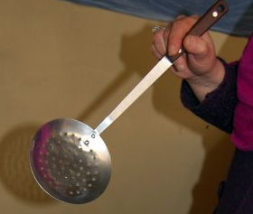 Une écumoire, ça sert à prendre les frites sans l'huile. Le mot "écumoire" rime avec : armoire, tiroir, baignoire, passoire, miroir, couloir, soir, boire, ...